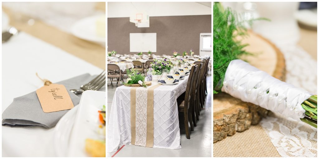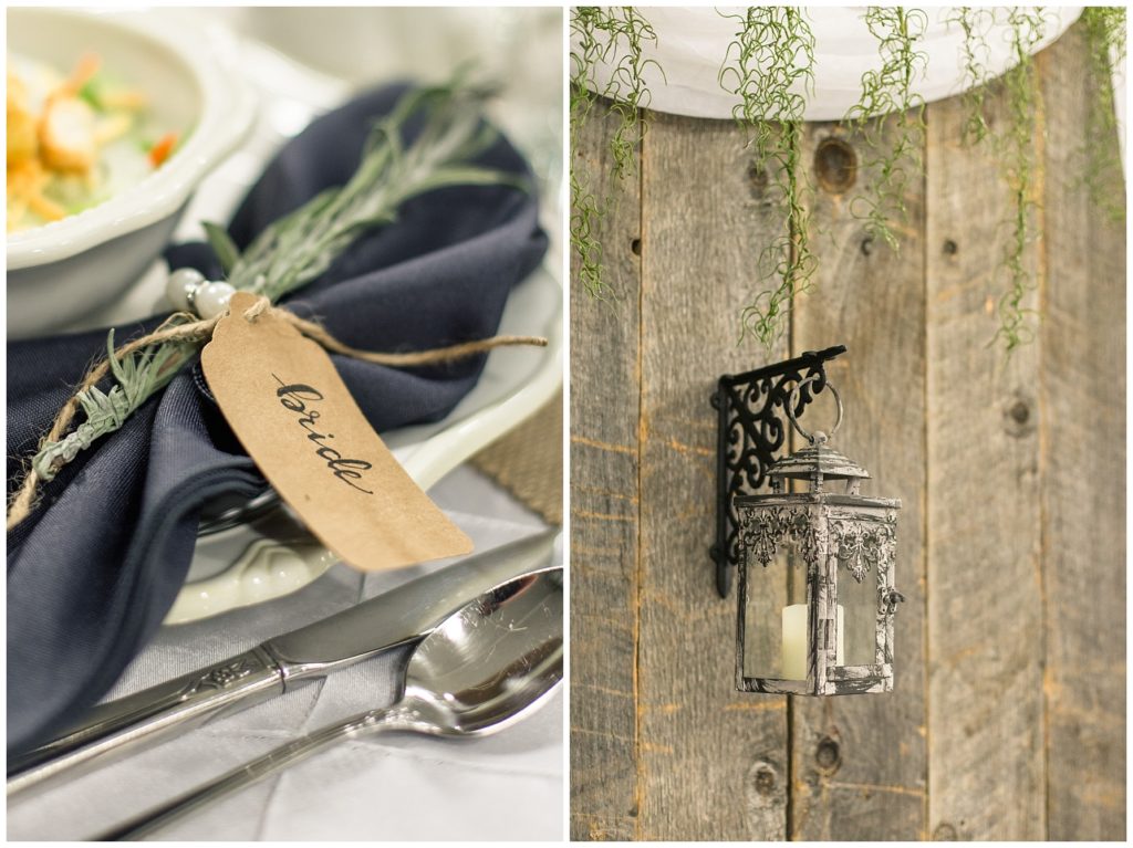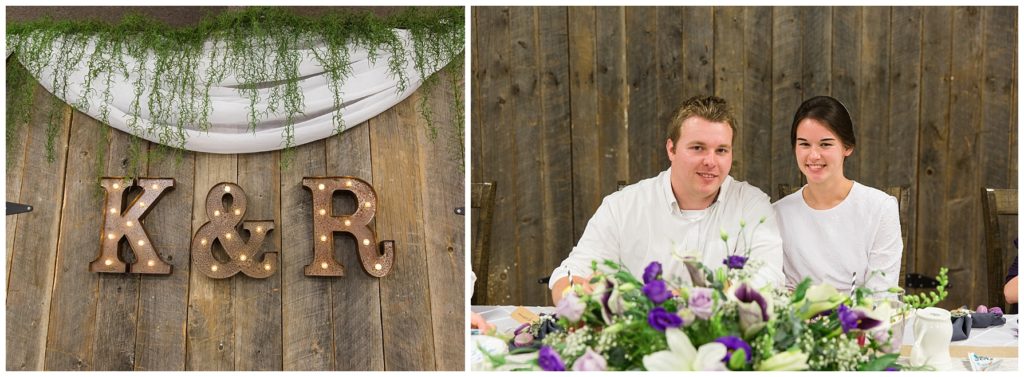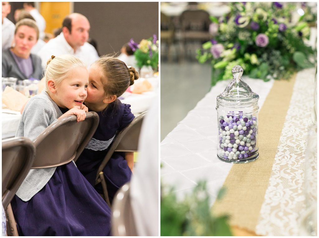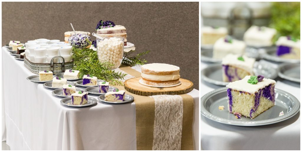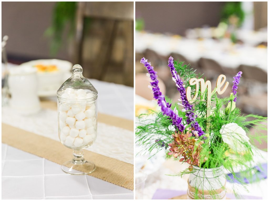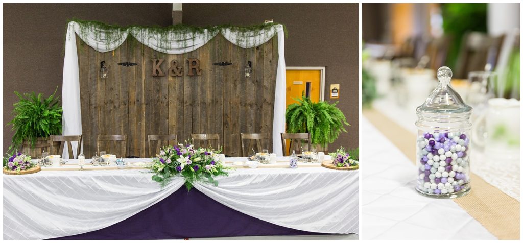 The reception was decorated with rich purples and greens and lots of little details- beautifully tied napkins and macarons on the bridal table, individual salads and pretty little popcorn bags on the appetizer table, to name a few. I especially loved the rustic wood backdrop behind the bridal table!