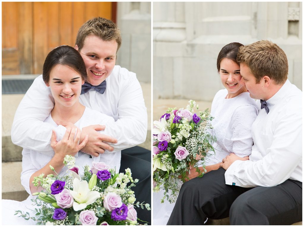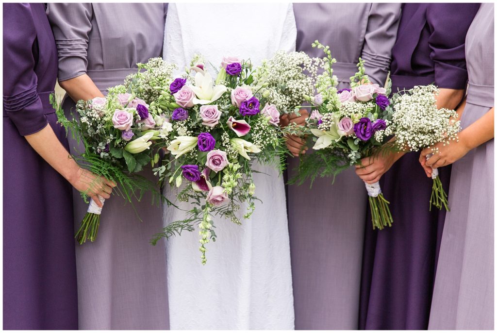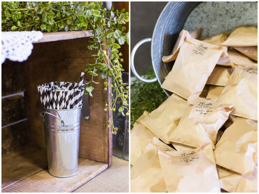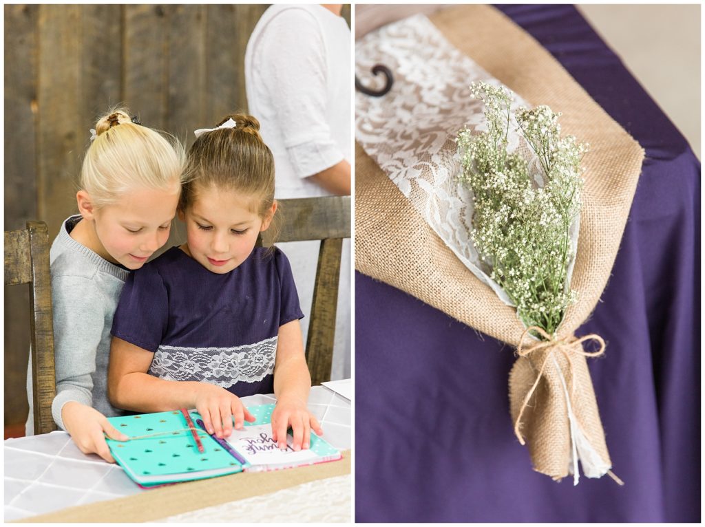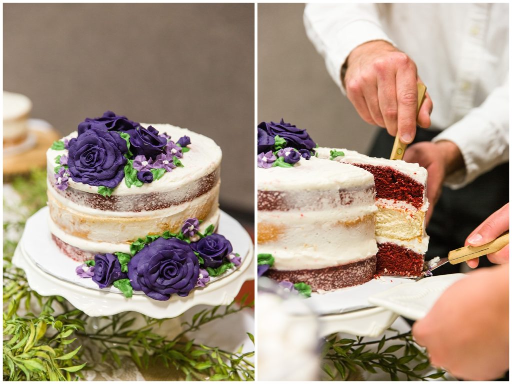 The reception was decorated with rich purples and greens and lots of little details- beautifully tied napkins and macarons on the bridal table, individual salads and pretty little popcorn bags on the appetizer table, to name a few. I especially loved the rustic wood backdrop behind the bridal table!