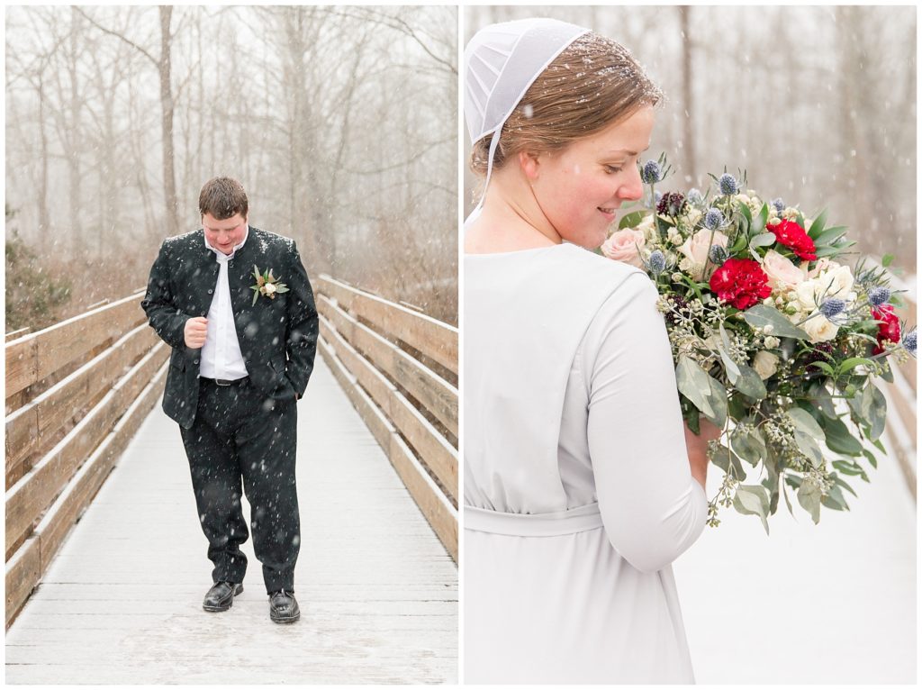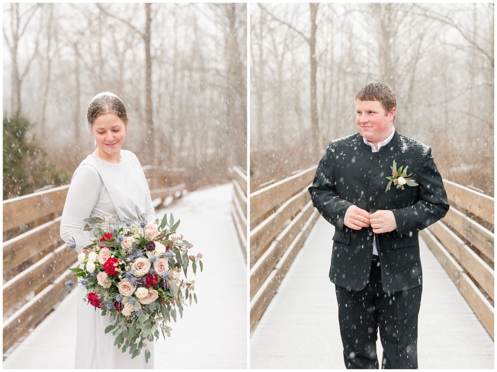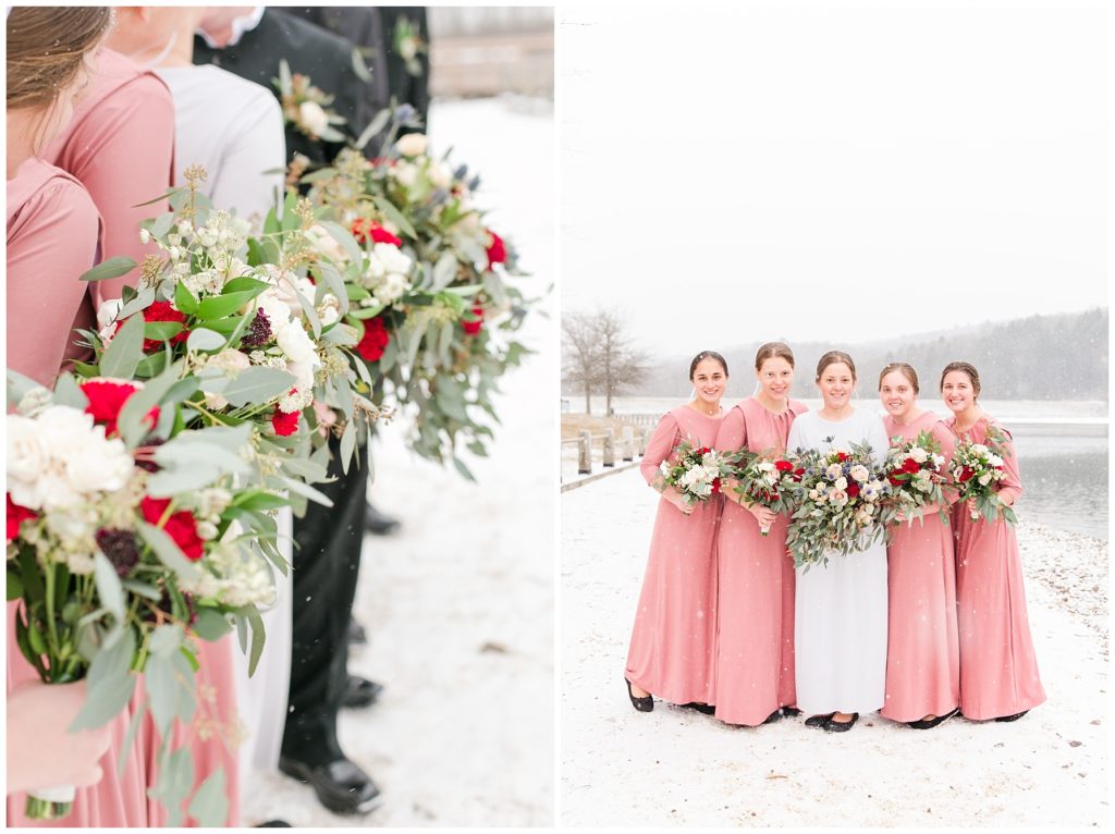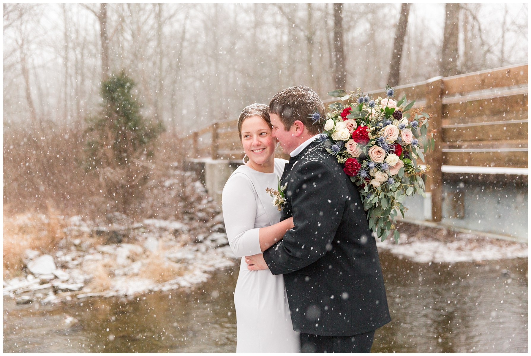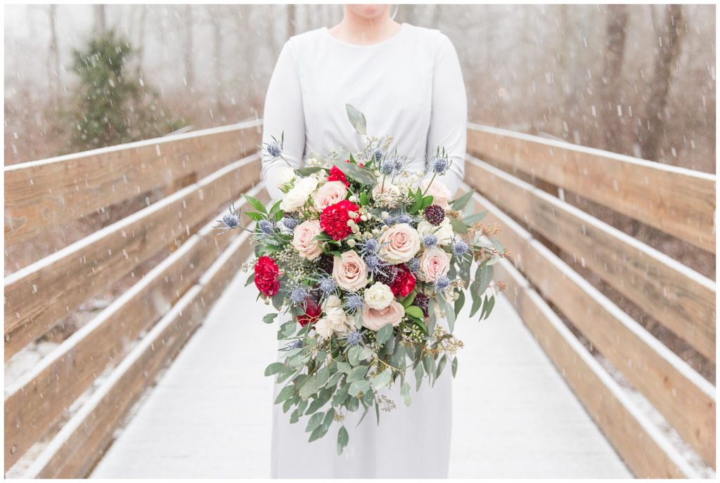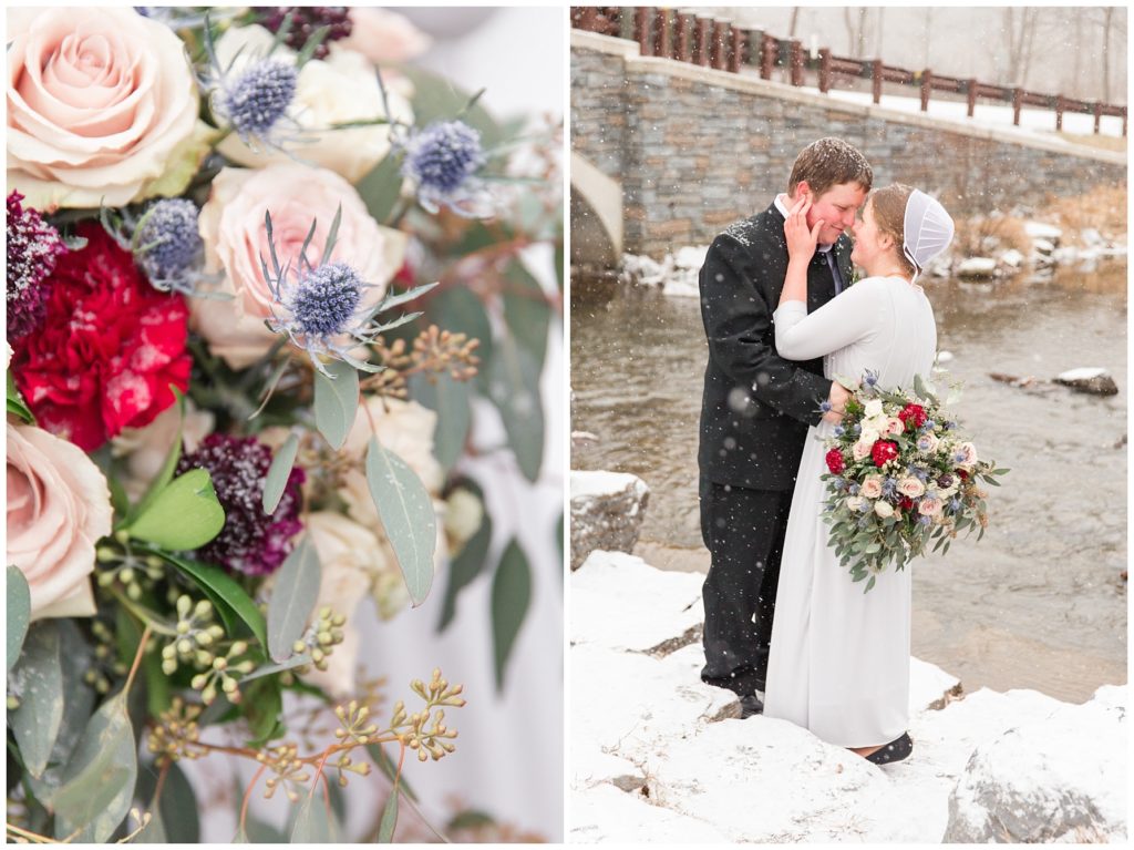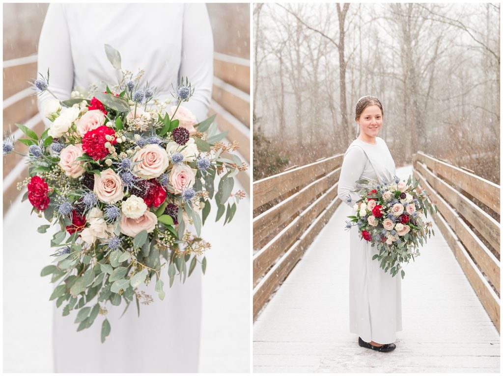 The first wedding of 2020 for Higher Focus Images was this absolutely gorgeous one! Curtis and Laura were married on a snowy day in Perry County, only a short drive from where we live. It started out very dark and gray, with leaden skies- then suddenly it started snowing and everything was white almost instantly! We were so happy it did because her colors of rose and blue were breathtaking with all that snow for a background. And those florals… I cannot get over how beautiful they were. Laura arranged them herself! The photos at the park did get cut a little short when there was just too much snow coming down and everyone was getting too cold! But I could have photographed everything all day.