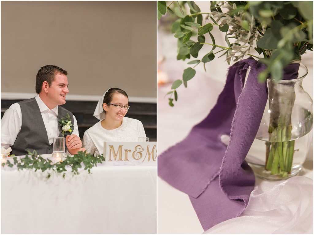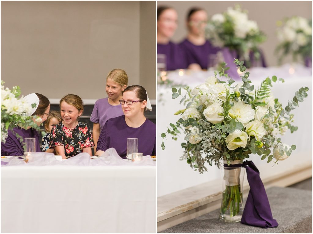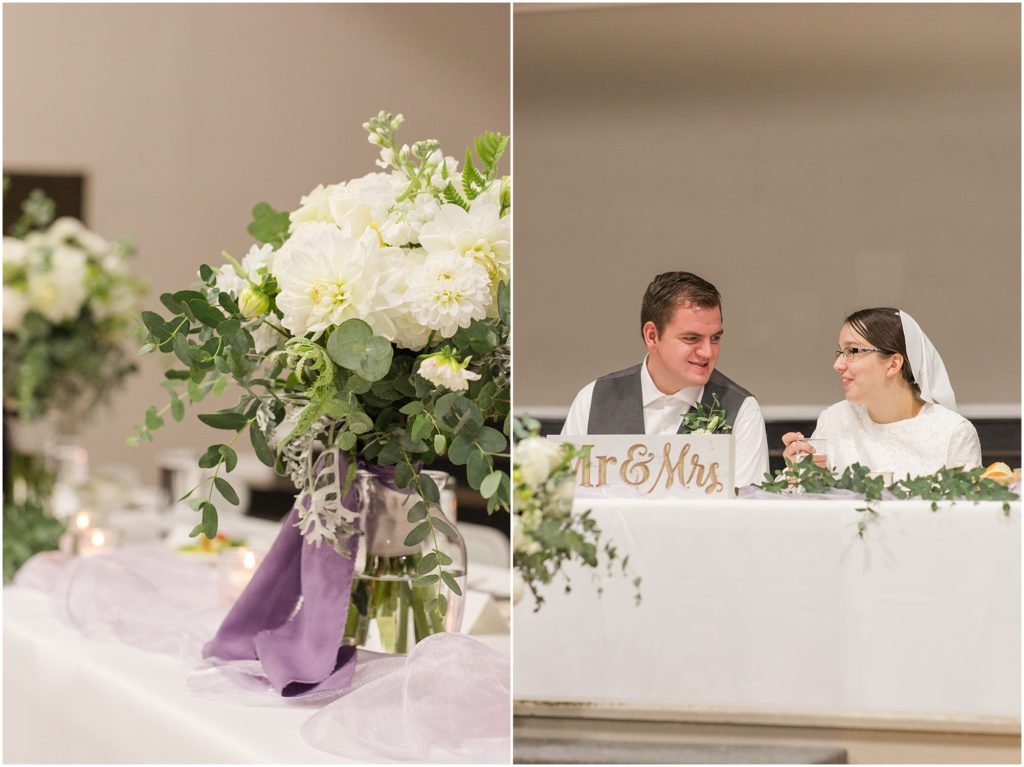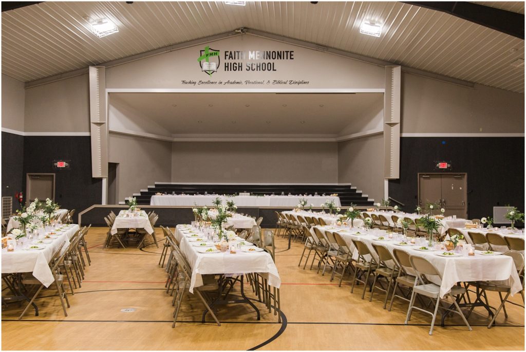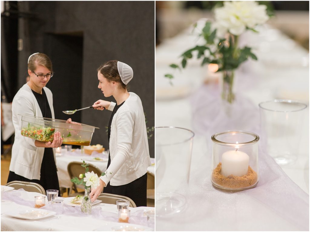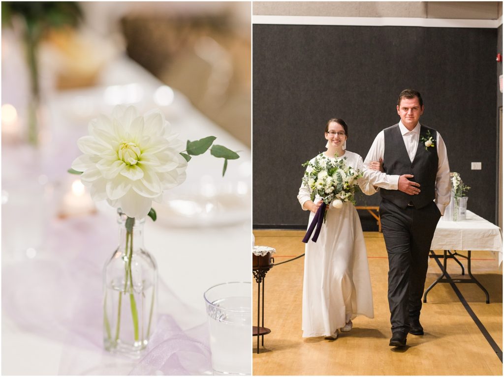 The ceremony was held outdoors under the tall trees after their rented church backed out on them. Thankfully the October sunshine warm and it was lovely! The reception was held at Faith Mennonite High School, with beautiful dahlias and candles.