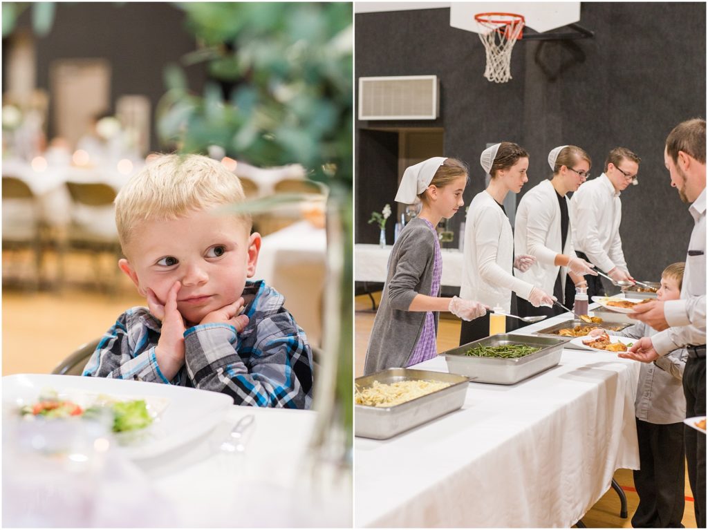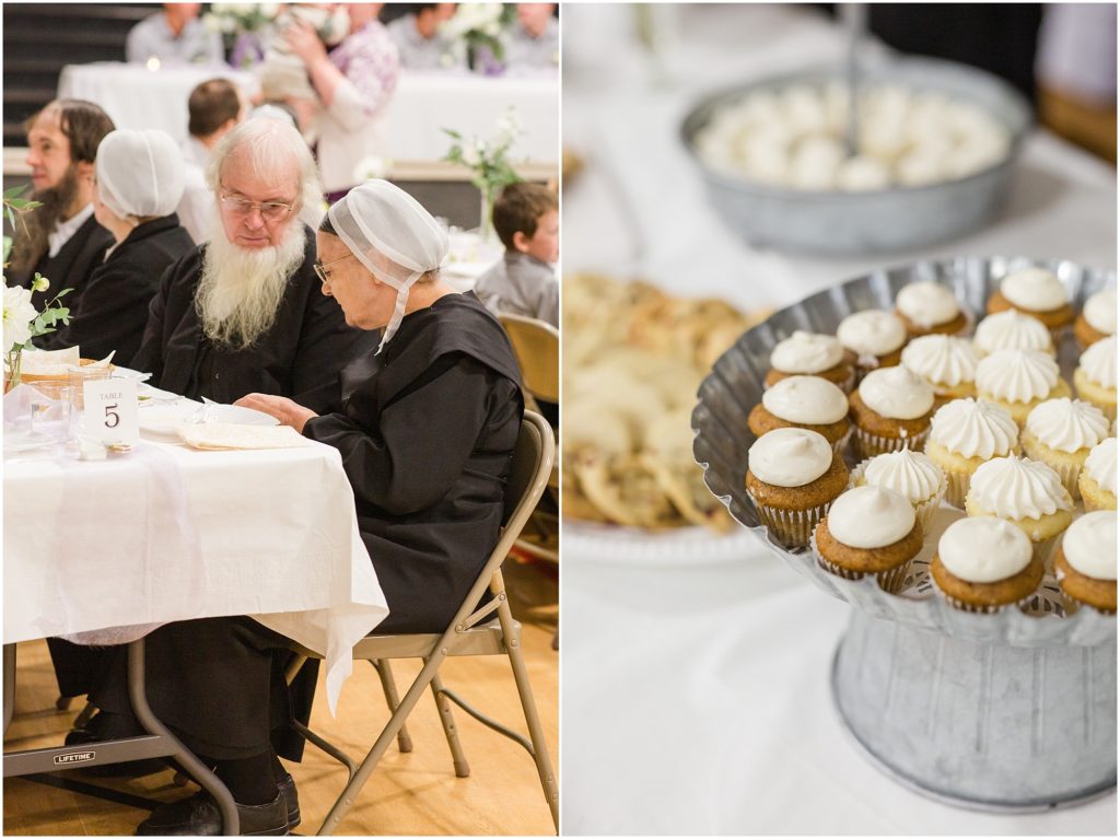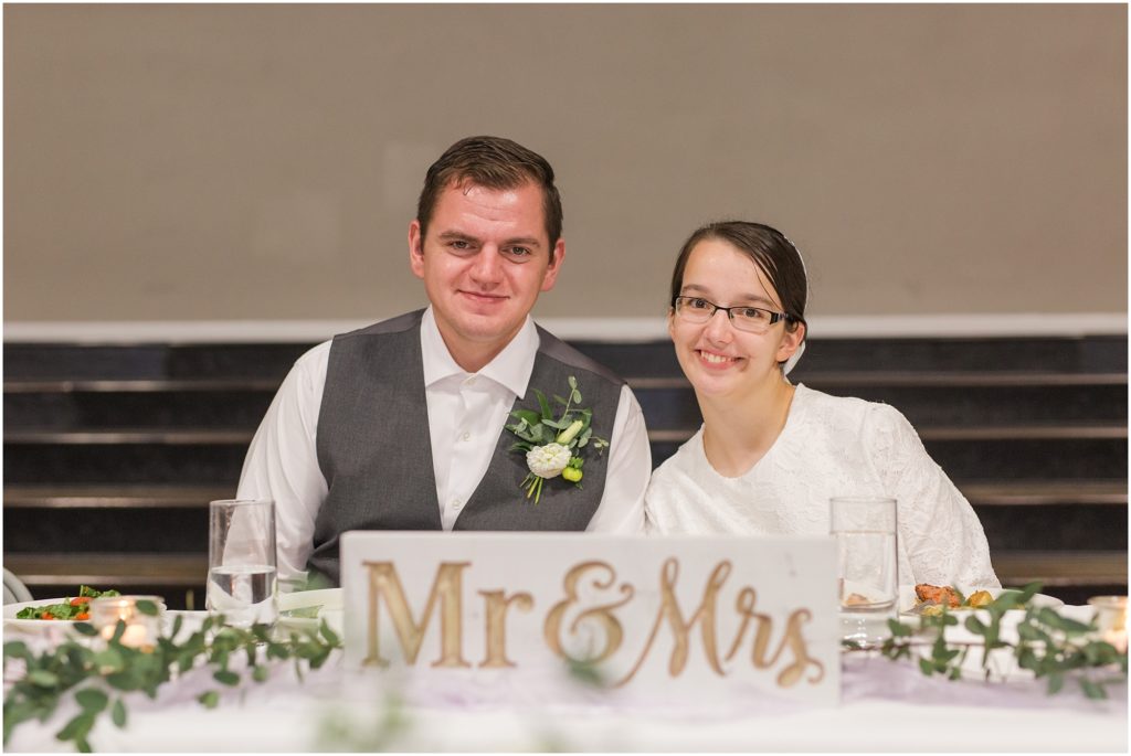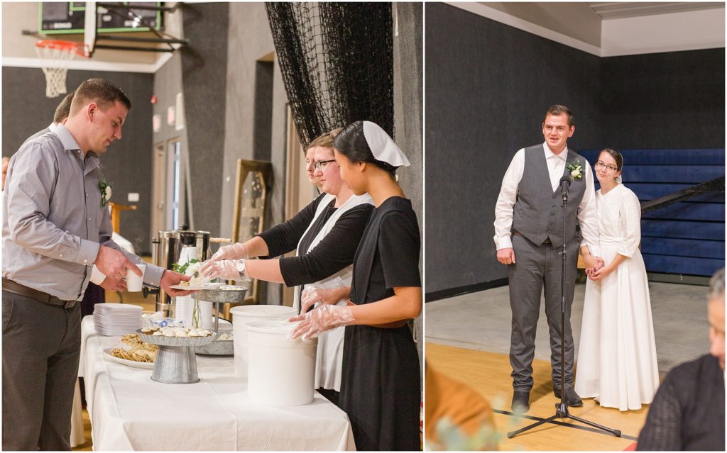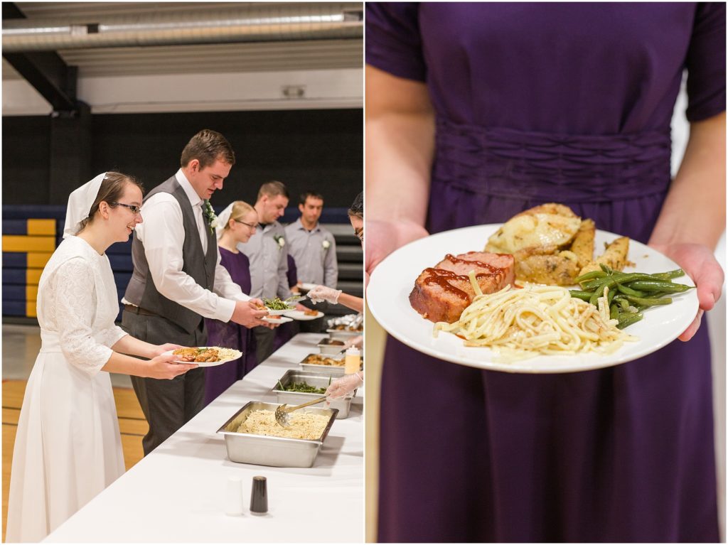 The ceremony was held outdoors under the tall trees after their rented church backed out on them. Thankfully the October sunshine warm and it was lovely! The reception was held at Faith Mennonite High School, with beautiful dahlias and candles.