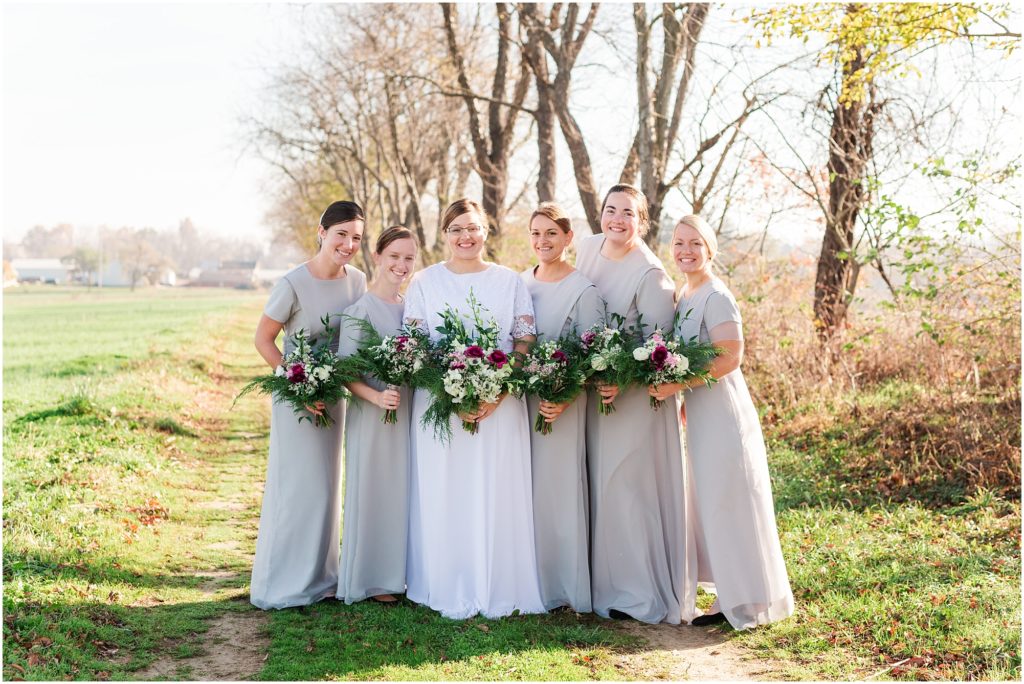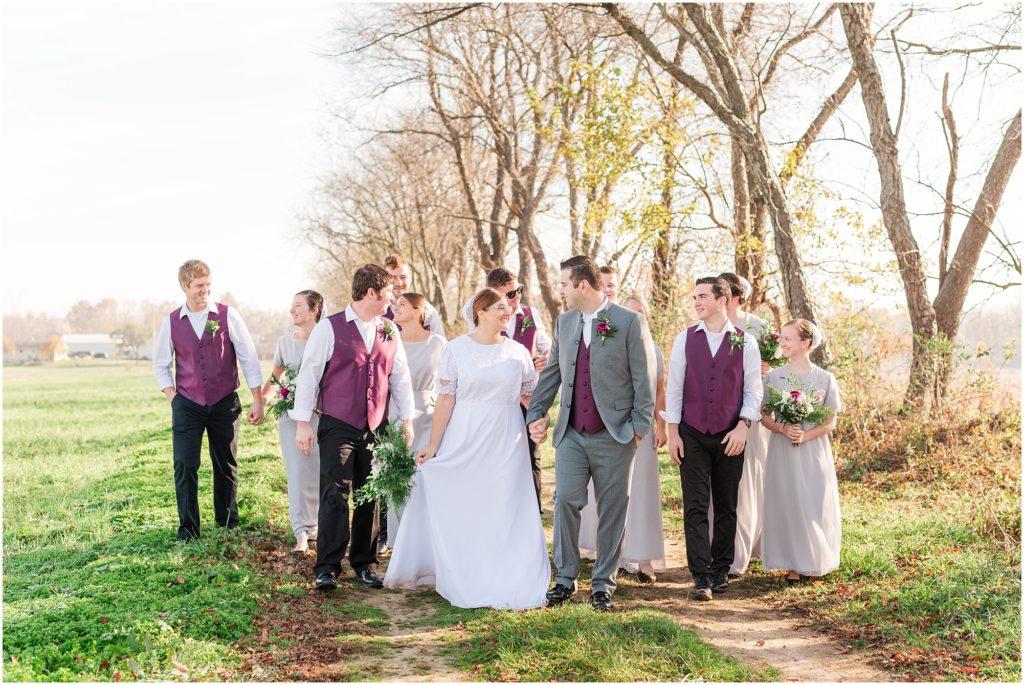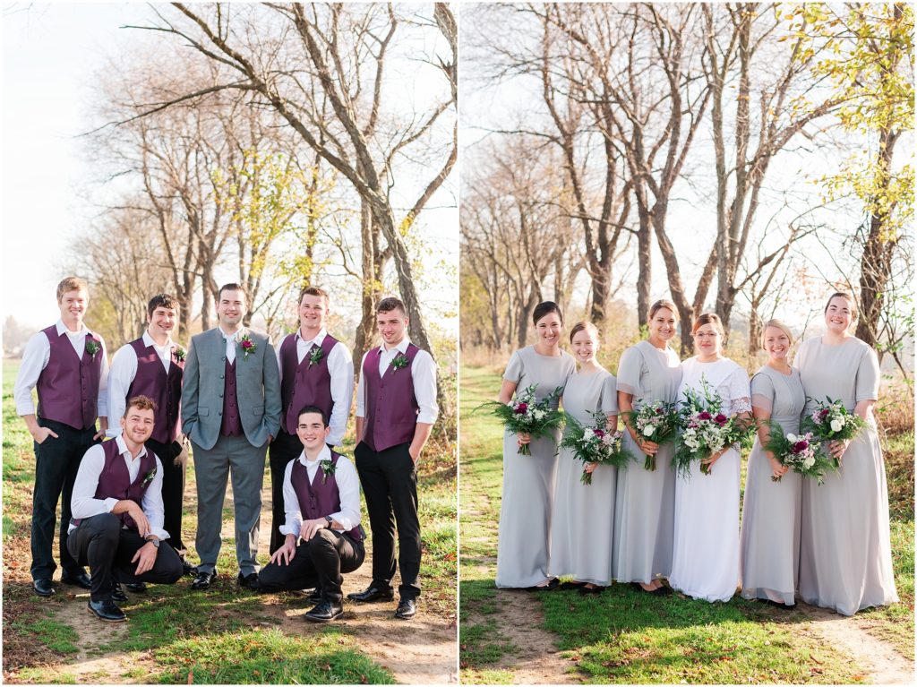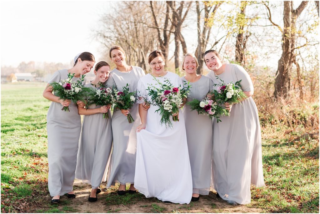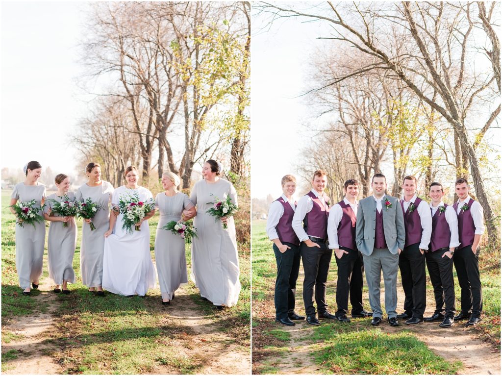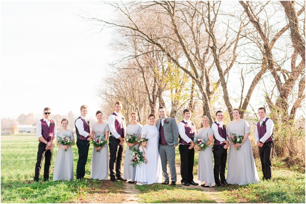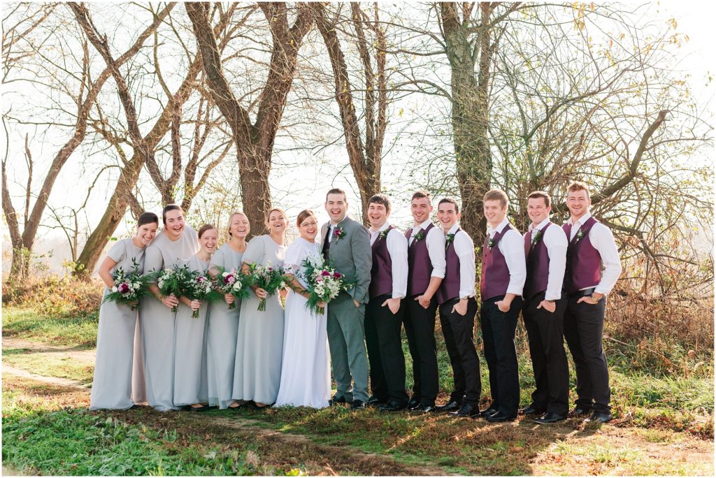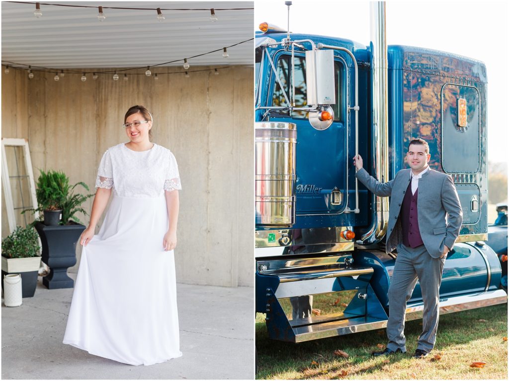 Chad and Ivy shared their first look under the colorful autumn trees along the lane. We started out with portraits at the neighbors barn and then met the bridal party at one of the farm field lanes. They have such a fun group of friends! Trucks were a central theme of the day as that is Chad’s family occupation. He and his co drivers had all their trucks at the wedding venue, so of course we had to do some pictures with those!