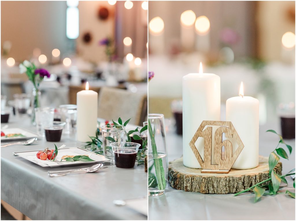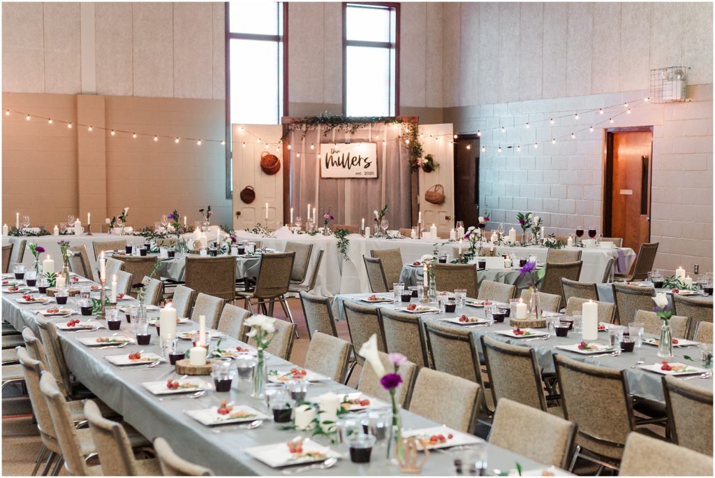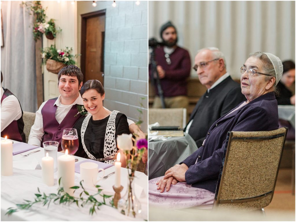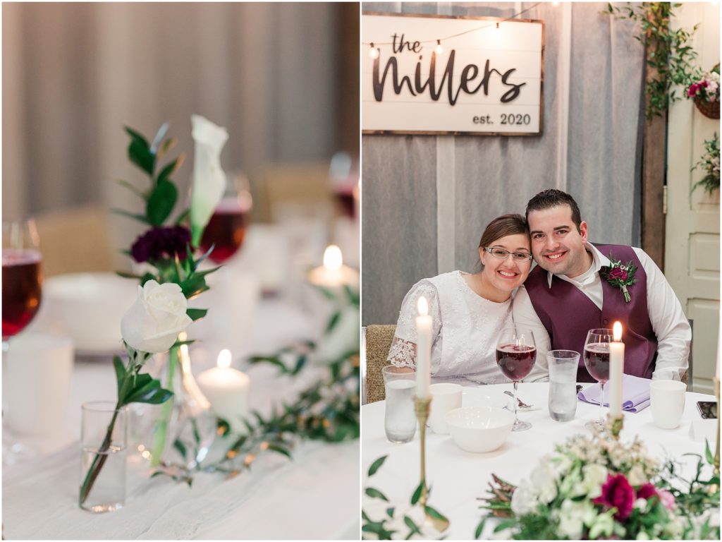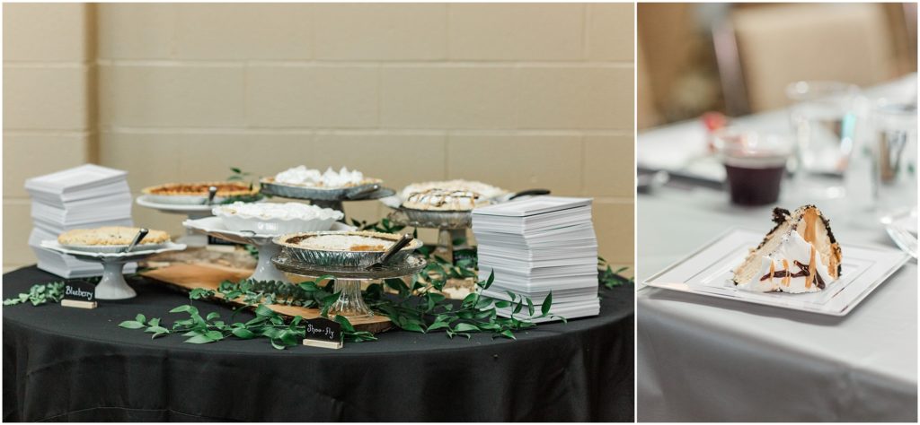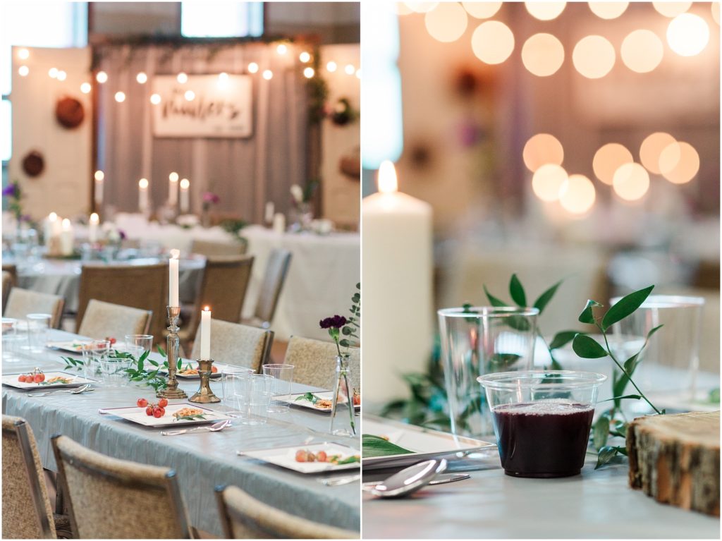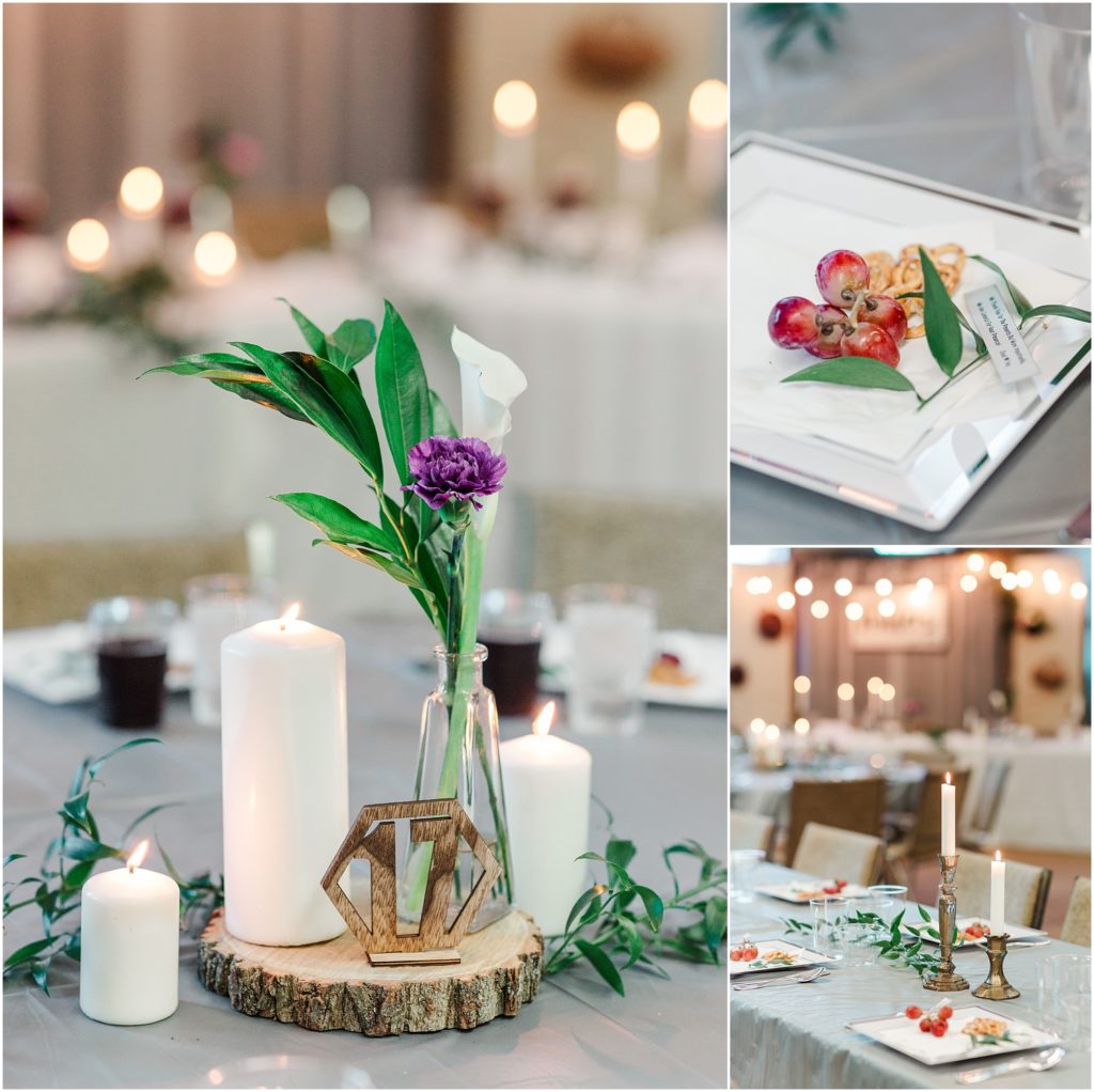 The reception was beautifully decorated with purple and grey, with lots of glowy light and candles. The meal was catered by Country Cooks Catering & Bakery and it was absolutely amazing! The pulled pork was perfection. Dessert was a variety of delicious pies. ( I have to say that one of my favorite parts of wedding receptions is getting to enjoy the wedding meals! 🙂 )