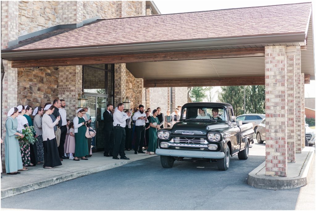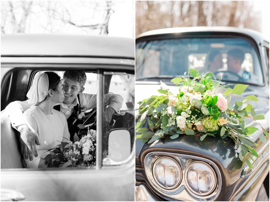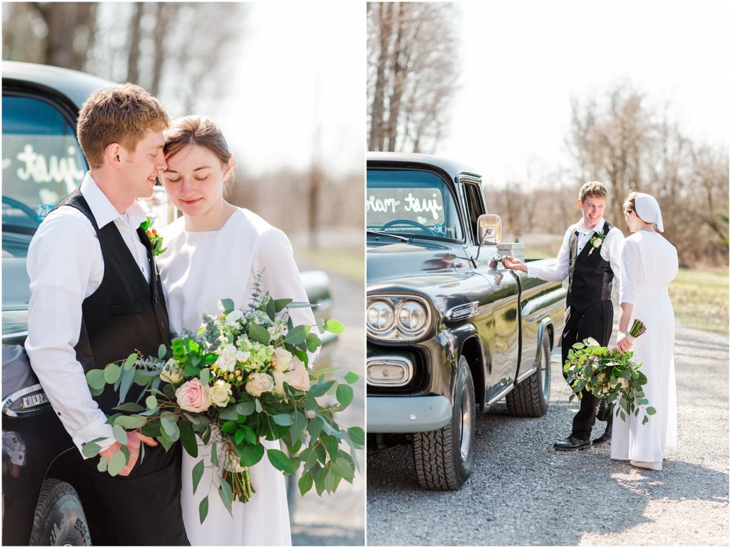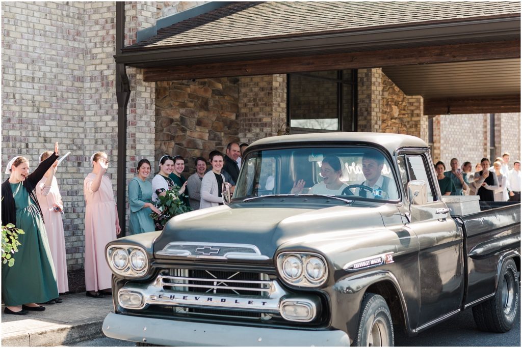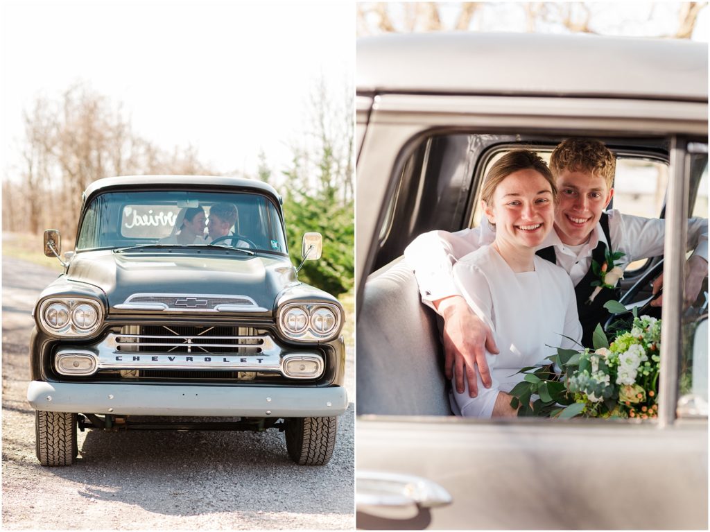 The early spring sunshine had turned quite warm by mid afternoon, and family and guests followed them outside to see them off. Trevor’s old truck made the perfect getaway vehicle!