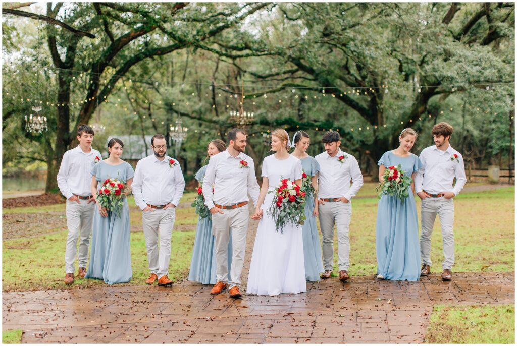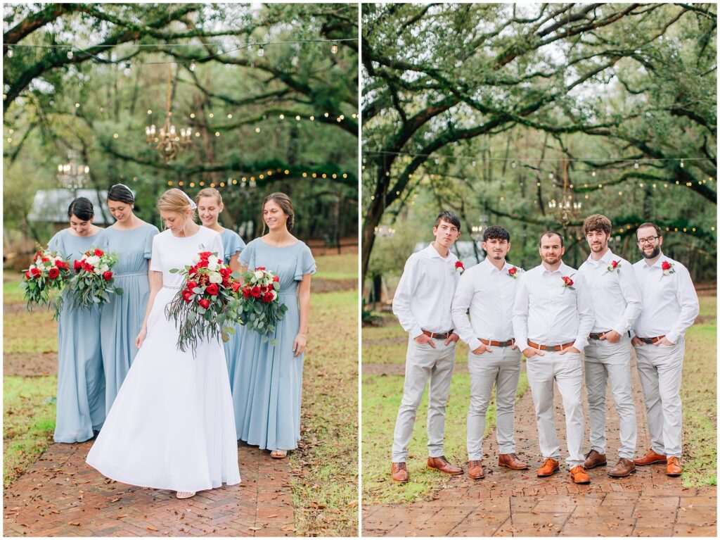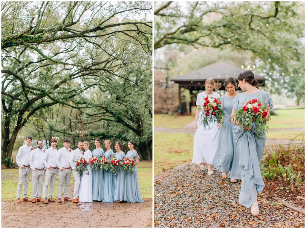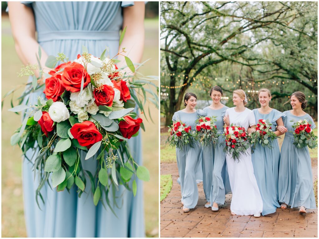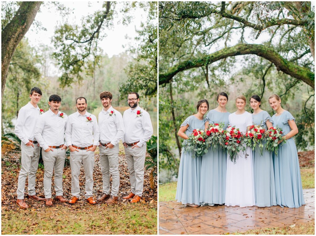 The portrait location was a country wedding venue with a few beautiful big live oak trees. I just loved all the green- so refreshing after all the brown at home. Heather chose dusty blue and red/ burgundy as her colors and it turned out so beautifully. The bridesmaids dresses are some of my favorites!Â