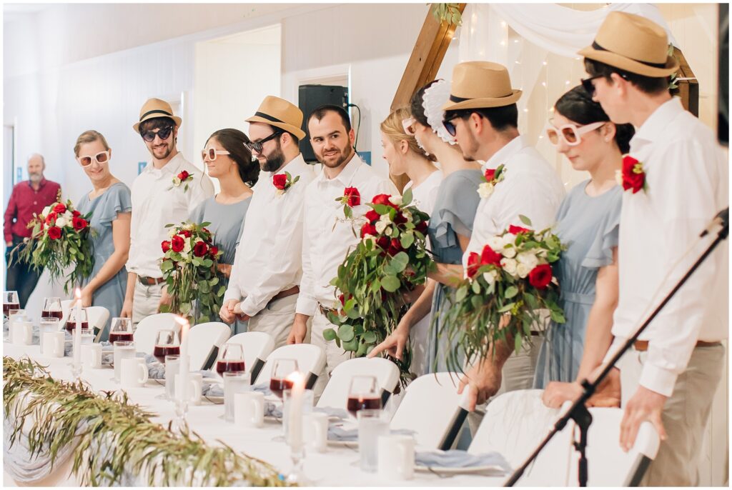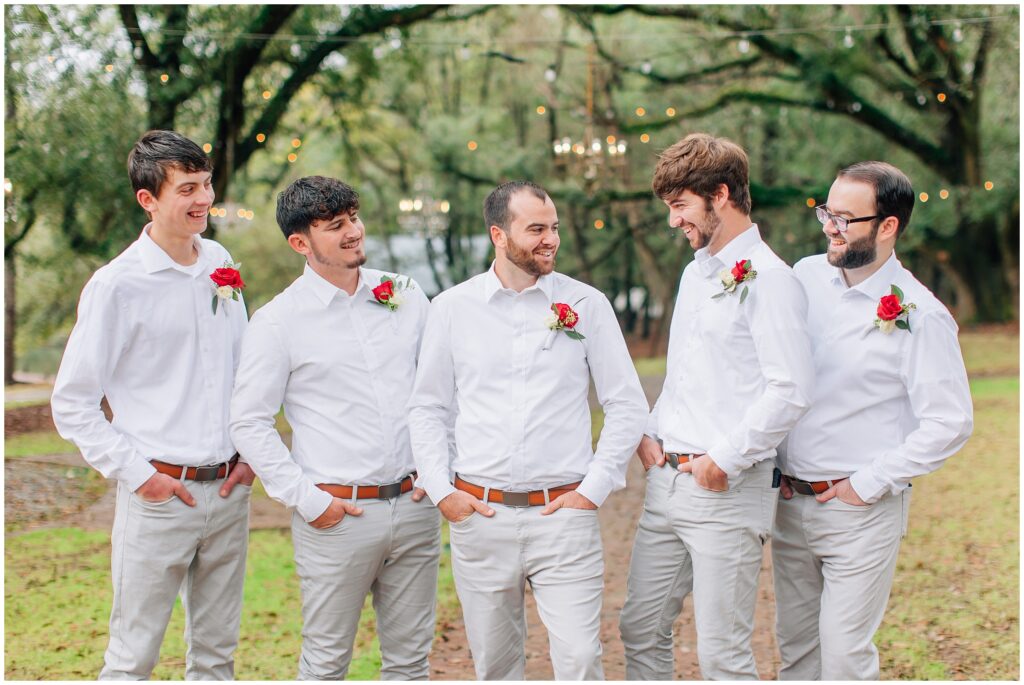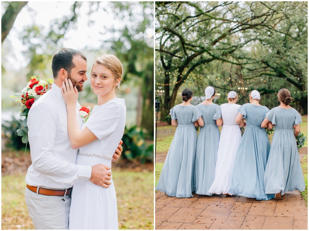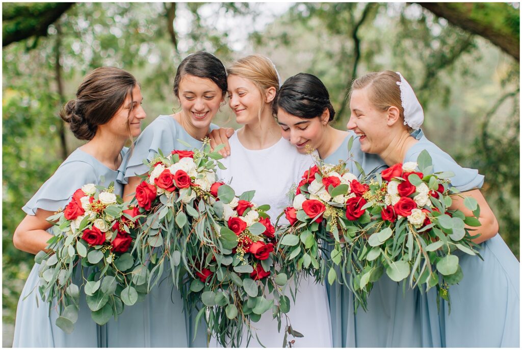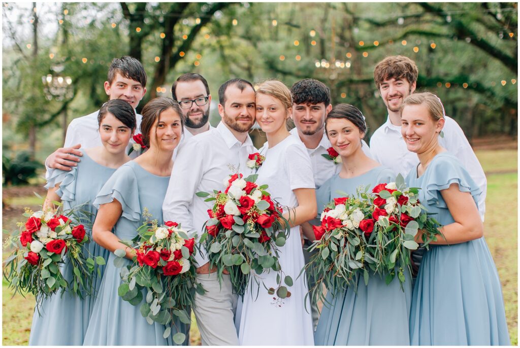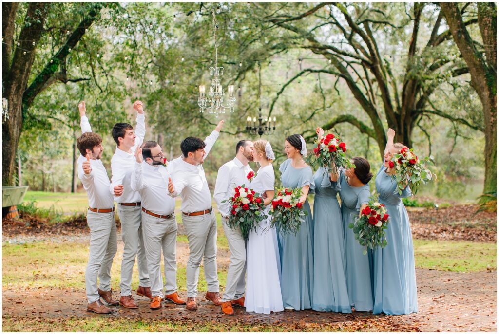 The portrait location was a country wedding venue with a few beautiful big live oak trees. I just loved all the green- so refreshing after all the brown at home. Heather chose dusty blue and red/ burgundy as her colors and it turned out so beautifully. The bridesmaids dresses are some of my favorites!Â