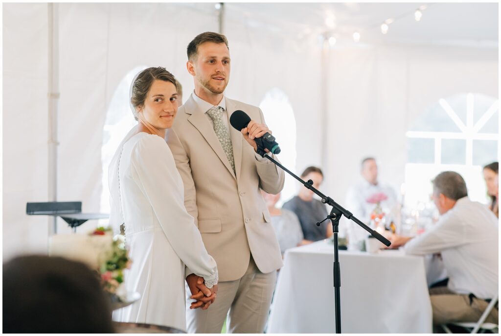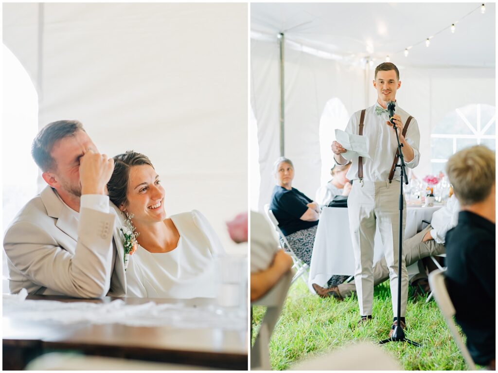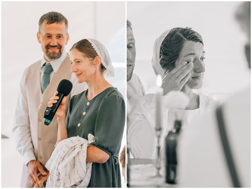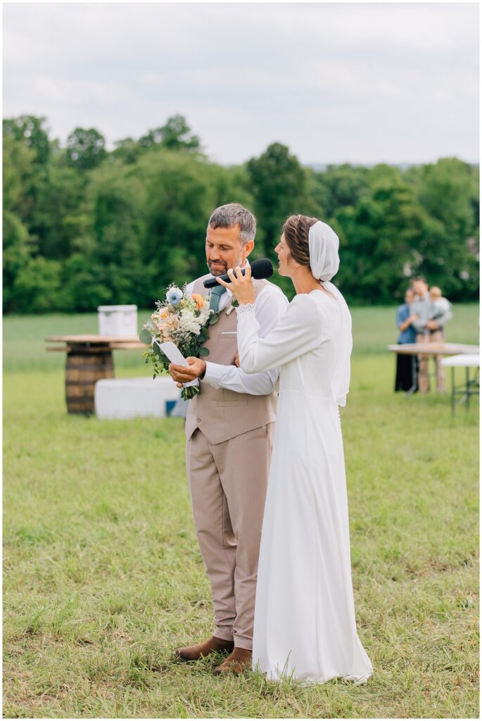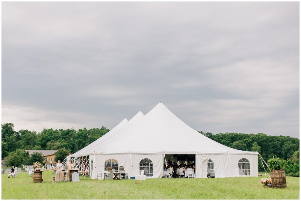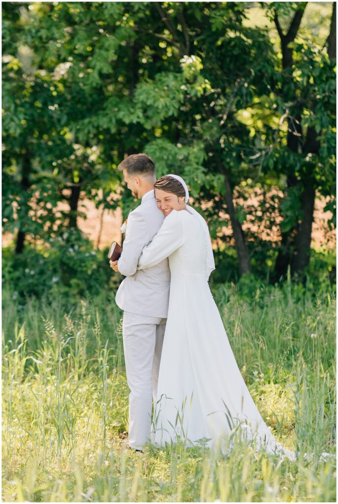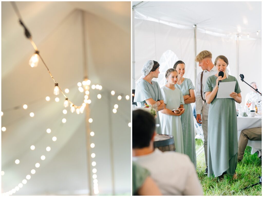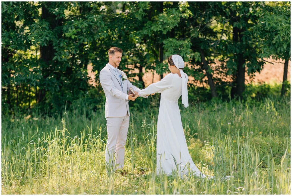 The wedding took place at the family’s cabin with beautiful views all around. The bride’s grandfather poured years of work and love into the place, but sadly he had passed on before he got to see his granddaughter married there. 2025 had such a rainy spring, and everyone was so happy to wake to sunshine on the wedding morning! There was rain in the forecast, but it held off until everyone was seated under the tent for the reception, and didn’t really start raining in earnest until just after they exited their reception. What an incredible blessing that was!