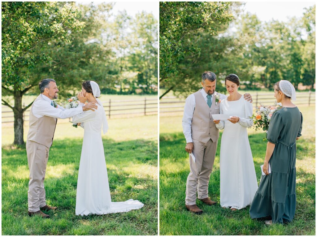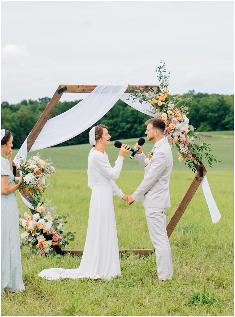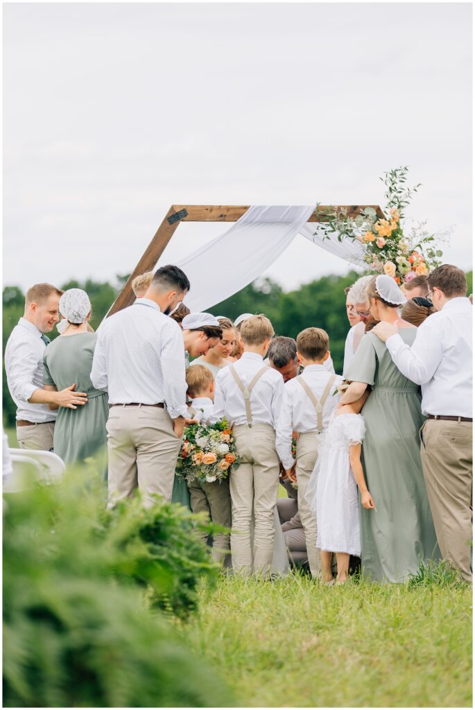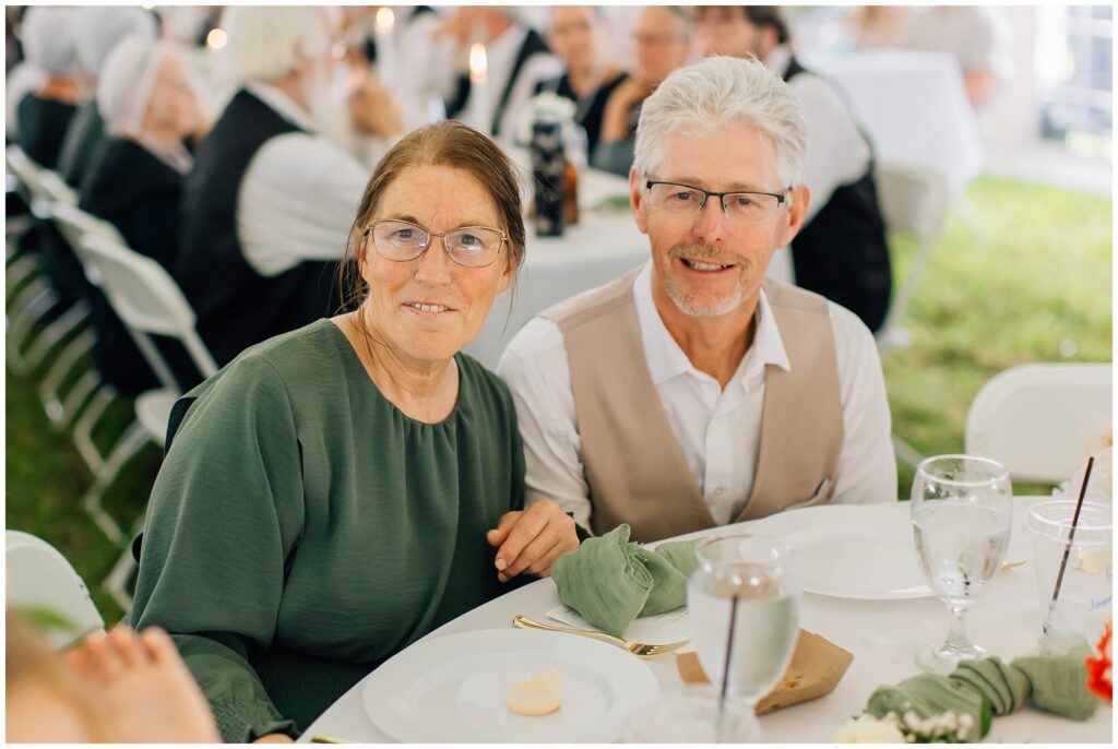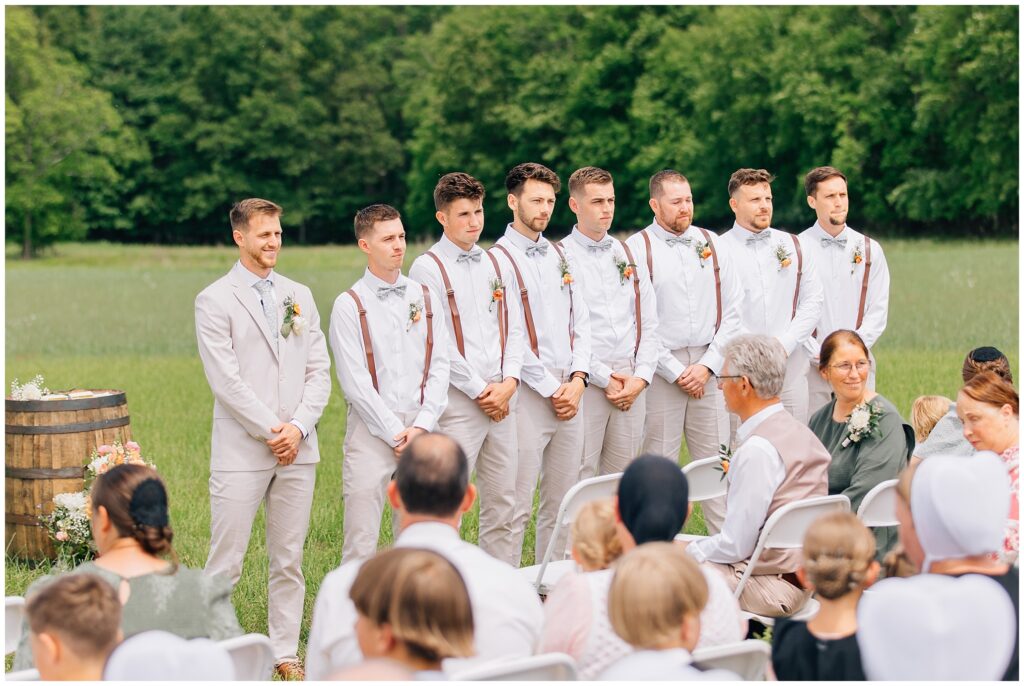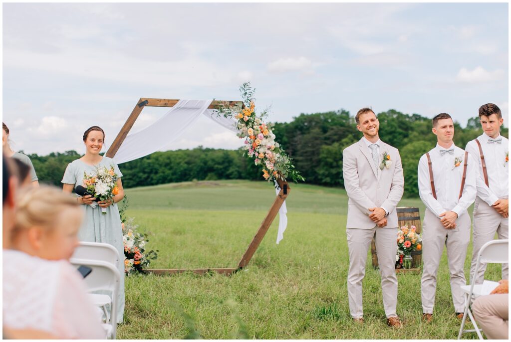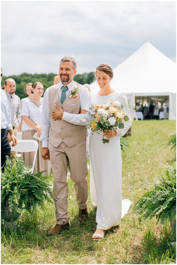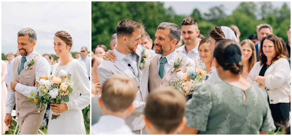 The wedding took place at the family’s cabin with beautiful views all around. The bride’s grandfather poured years of work and love into the place, but sadly he had passed on before he got to see his granddaughter married there. 2025 had such a rainy spring, and everyone was so happy to wake to sunshine on the wedding morning! There was rain in the forecast, but it held off until everyone was seated under the tent for the reception, and didn’t really start raining in earnest until just after they exited their reception. What an incredible blessing that was!