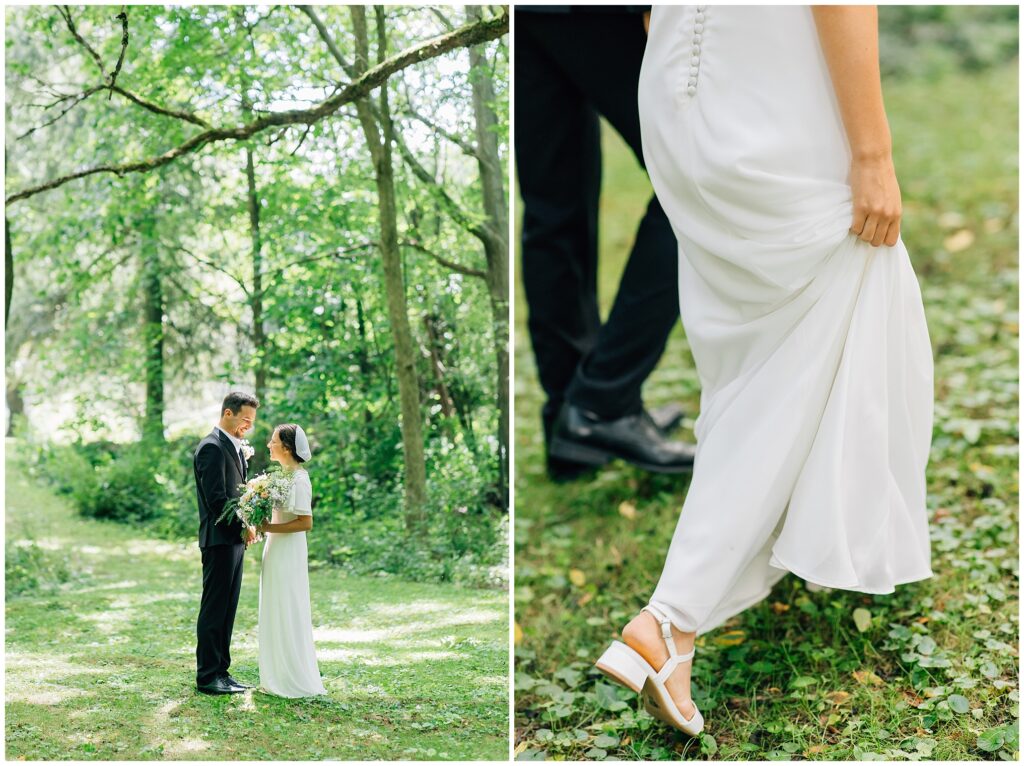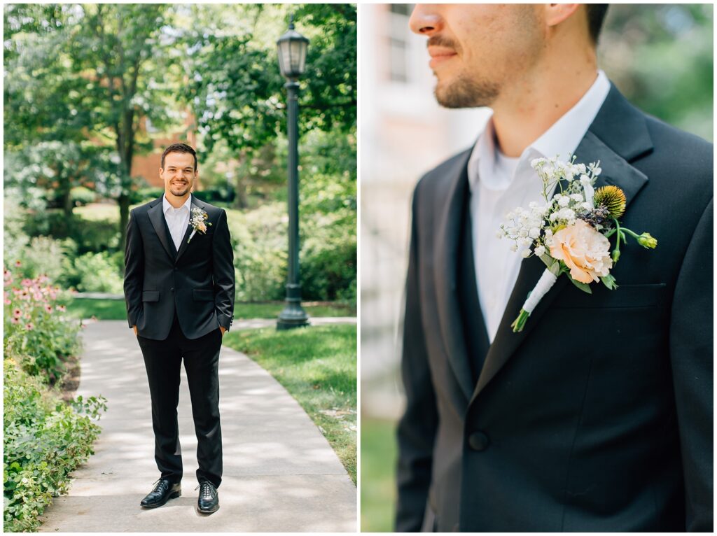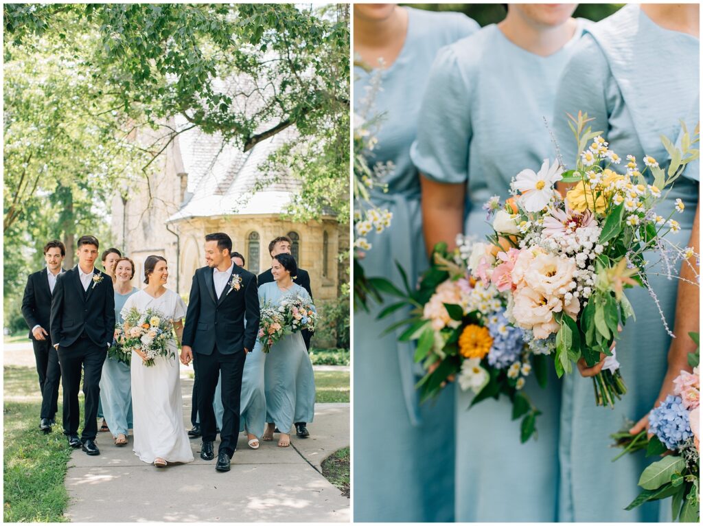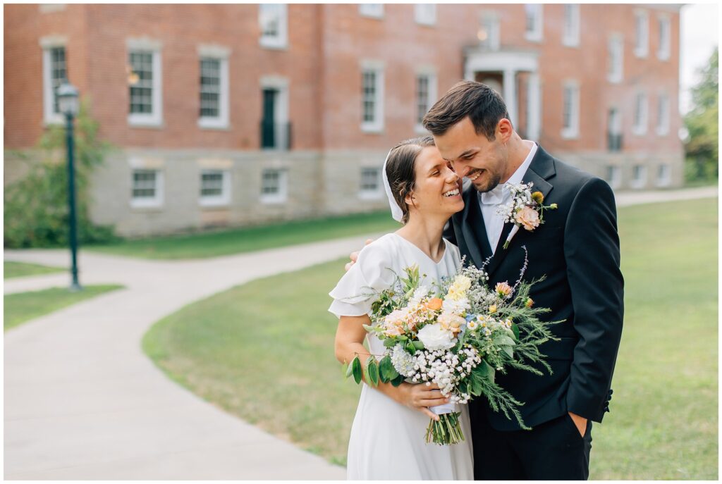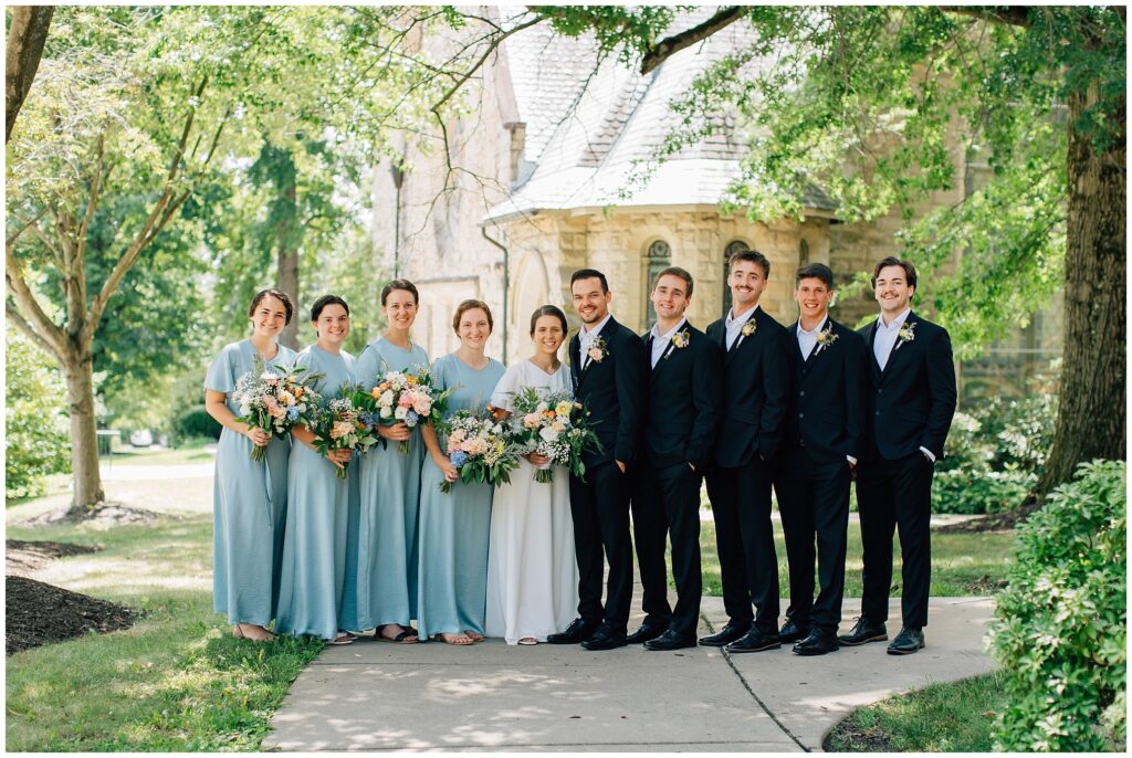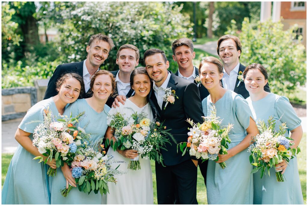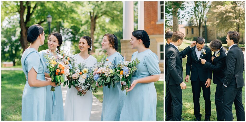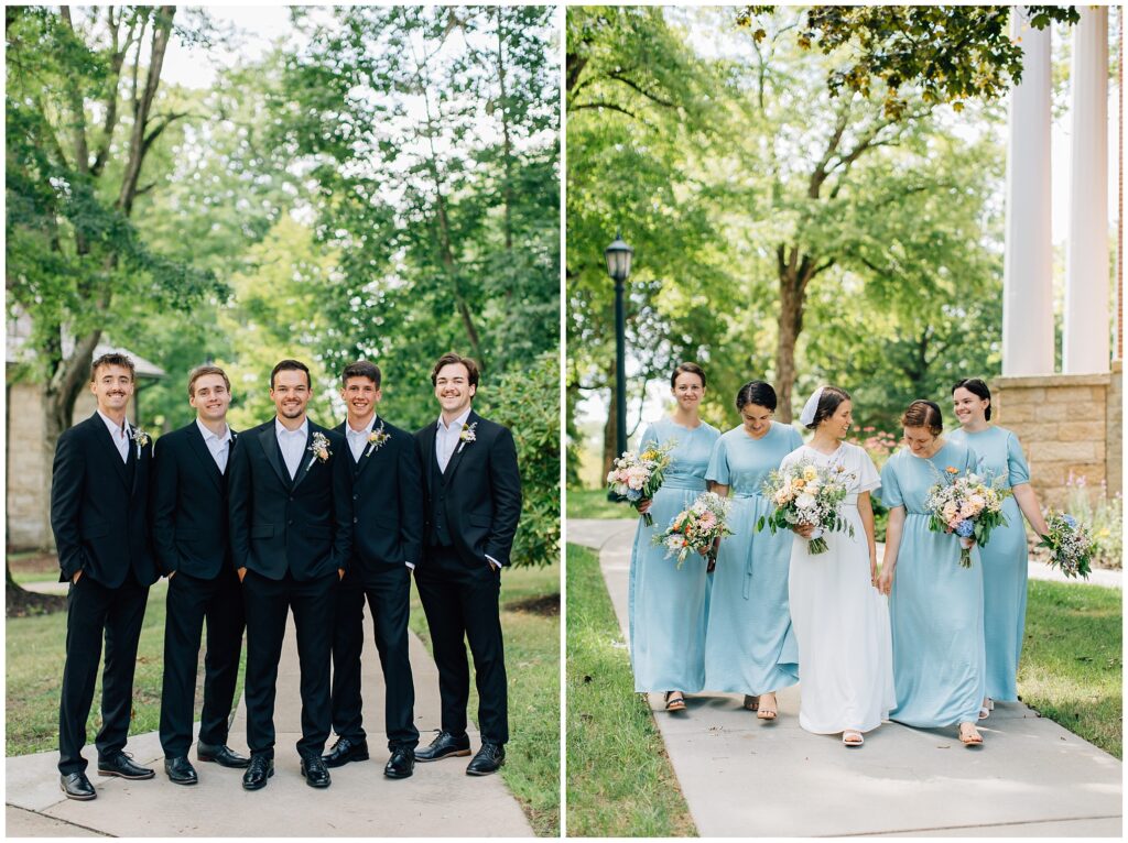 The bridal party had brunch together at the bride’s home and then she and her girls got ready for the day there. Harrison and Angeline shared a sweet first look in a clearing in the woods behind her house, then we went to the local college campus for the rest of the photos. They were so relaxed and happy and it was just a fun day all around!Â